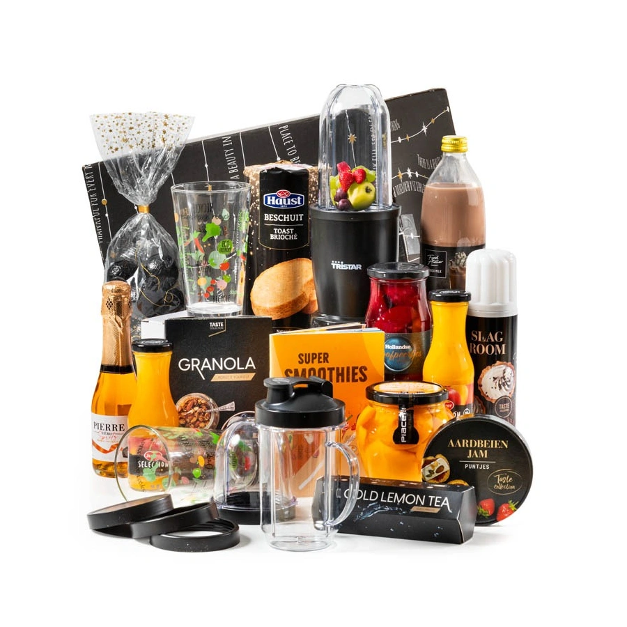 INHOUD: • Tristar smoothie maker, 0,5 ltr. De smoothie maker heeft 3 bekers en een “blender to go”-functie • Twee glazen maatbekers, 8,7 x 14,8 cm • Receptenboekje “Super Smoothies” • Pierre Zero sparkling Spritz 0% alcohol, 20 cl • Twee flesjes Juver mangosap, à 20 cl • Hollandse stoofpeertjes met kaneel, 370 ml • Piacelli perziken op siroop, 550 gram • Granola roast it yourself, 100 gram • Haust beschuit naturel, 125 gram • Aardbeien jam puntjes, 170 gram • Chocomelk, 500 ml • Slagroom, 250 ml • Cold brew tea, 6 x 1,8 gram • Chocolade boomhangers, 87,5 gram • Verpakt in een bijpassende geschenkdoos