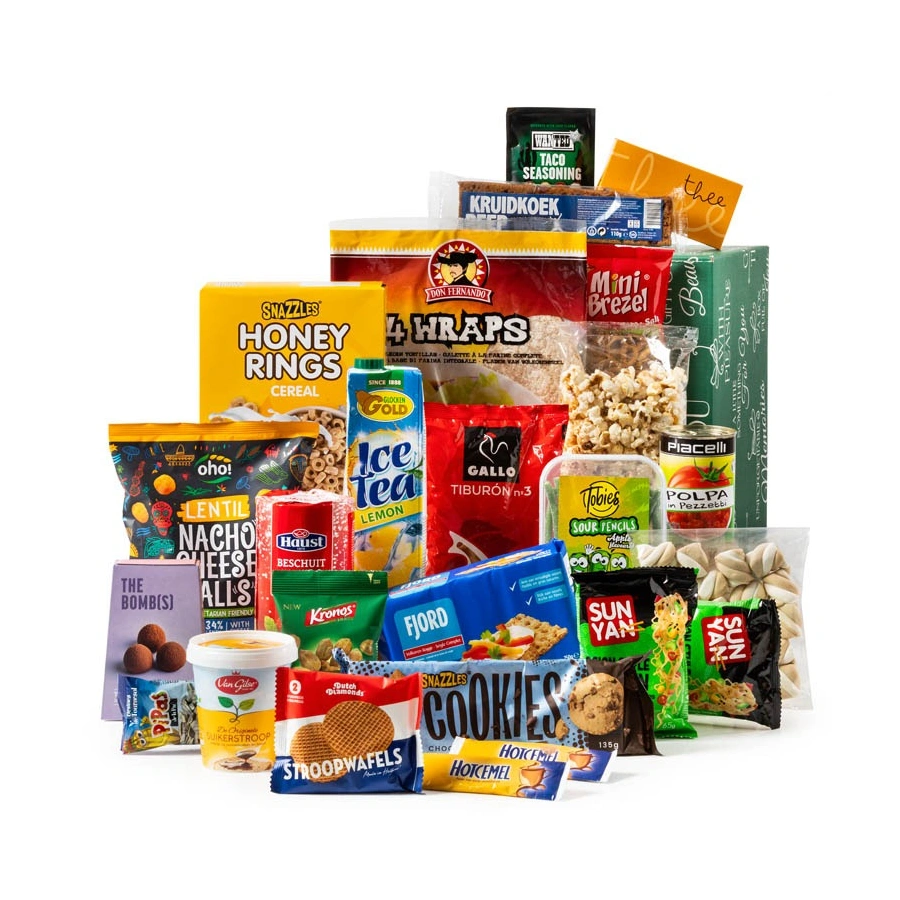 INHOUD: • Glockengold ijsthee citroen, 1 ltr • Nacho cheese balls, 100 gram • Pinda’s Jalapeno, 70 gram • Popcorn zeezout & zwarte peper, 80 gram • Dunicec mini brezel salt, 70 gram • Pipas de la Paz zonnebloempitten, 25 gram • Snazzles cereals honey rings, 250 gram • Haust beschuit naturel, 125 gram • Van Gilse suikerstroop, 500 gram • Fjord volkoren knäckebrod, 250 gram • Don Fernando 4 volkoren wraps, 250 gram • Taco seasoningmix, 40 gram • Schelpjes pasta, 250 gram • Piacelli tomatenblokjes, 400 gram • Twee pakjes Sun Yan noodles Asian style chicken, à 65 gram • Thee Fairtrade, 5 x 2 gram • Twee Hotcemel sticks instant chocolade melk, à 25 gram • Sweetness truffels, 50 gram • Snazzles chocolate chip cookies, 135 gram • Dutch Diamonds stroopwafels, duopack 80 gram • Koekreep, 110 gram • Tobies candy apple pencils, 200 gram • Mallows, 90 gram • Verpakt in een bijpassende geschenkdoos