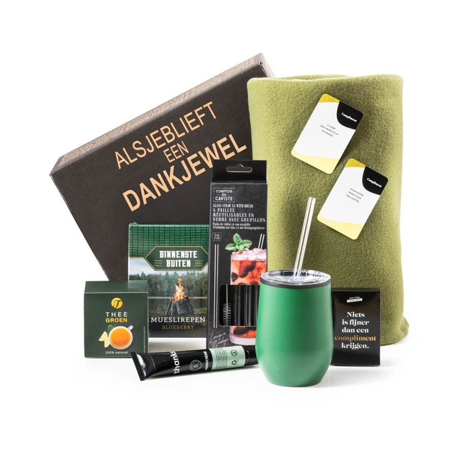 INHOUD: • RVS reisbeker groen 300 ml, Ø 8 x 12 cm • Rietjes glas met borstel 20 cm, 4 st • Fleecedeken groen, 130 x 160 cm • Thanks handcrème, tube 50 ml • Compliment cards • Groene thee, 10 x 1,5 gram • Mueslirepen blueberry, 3 x 20 gram • Verpakt in een bijpassende geschenkdoos