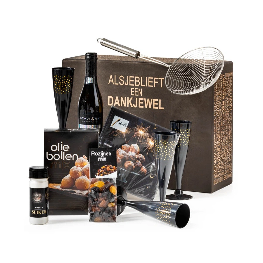 INHOUD: • Servetten, 33 x 33 cm • Schuimspaan rvs greep Ø 15 cm • Zwarte kunststof champagneglazen, set van 4 st • Scavi & Ray Frizzante, 20 cl • Mix voor oliebollen, 500 gram • Rozijnenmix, 100 gram • Poedersuiker, 70 gram • Verpakt in cellofaan met strik en geleverd in een bijpassende geschenkdoos
