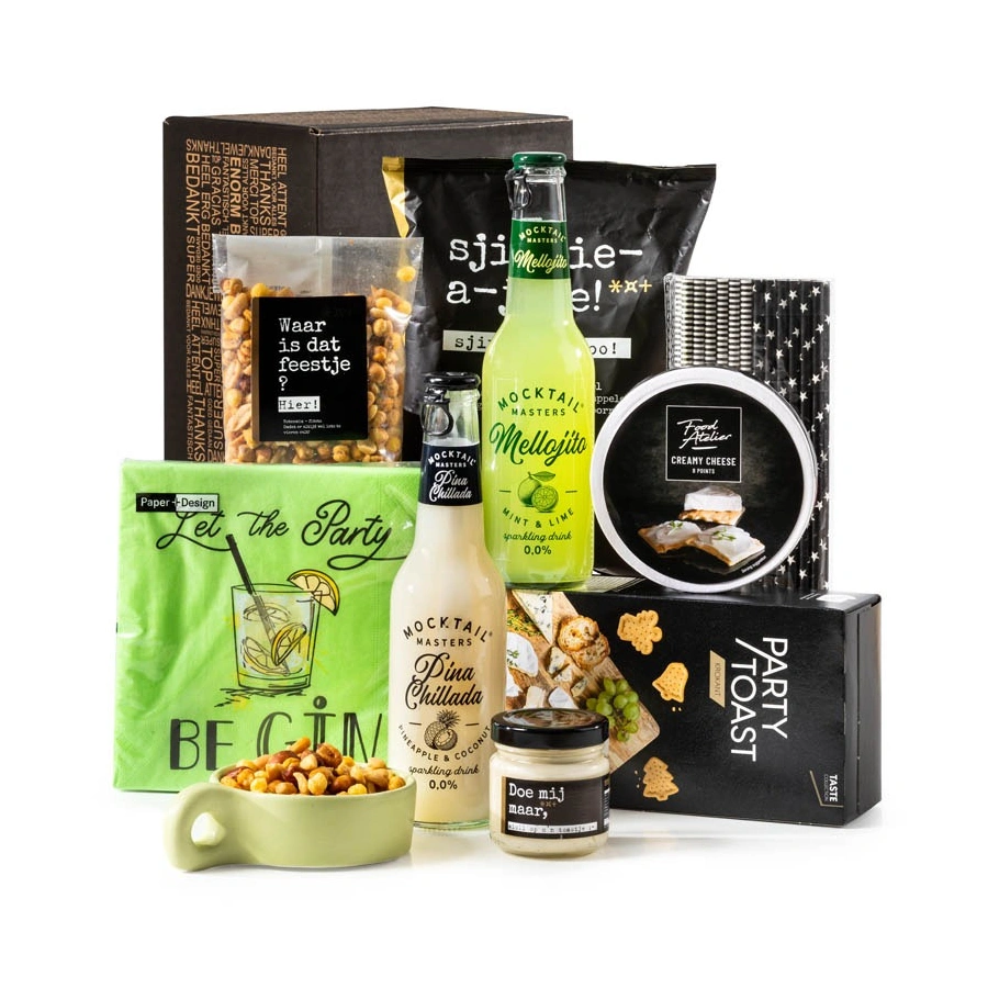 INHOUD: • Schaaltje groen aardewerk met oor, 13,5 x 9,5 x 3,3 cm • Papieren rietjes bio, 20 cm • Party servetten, 33 x 33 cm • Mocktail Masters Mellojito mint & lime 0.0%, 275 ml • Mocktail Masters Pina Chillada pineapple & coconut 0.0%, 275 ml • Sjippie-a-jee! naturel chips, 70 gram • Waar is dat feestje? pinda mix, 125 gram • Party toast, 80 gram • Doe mij maar… Aioli, 90 gram • Kaaspuntjes, 125 gram • Verpakt in een bijpassende geschenkdoos