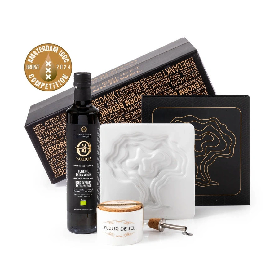 Dit bijzonder fraaie kerstpakket bevat een elegante schaal met boom patroon om (stok)brood te dippen. Een mooie manier om deze olijfolie in te presenteren. De olijfolie kleurt van licht naar donker door de trapsgewijze niveaus. Deze keramieken schaal is 18 cm bij 18 cm en heeft een dikte van 1,5 cm. De schaal is vaatwasser bestendig en heeft een mat witte kleur. De fairtrade olijfolie is van biologische geteelde olijven en is koud geperst, dus extra virgine. De olijven komen uit Tunesië van lokale boeren. De focus: het creëren van voortreffelijke biologische olijfolie die getuigd van hun toewijding en erfgoed. Deze olijfolie heeft wereldwijd diverse awards ontvangen. Uiteraard hoort hierbij mooi grof zeezout in een luxe pot. Een geweldig mooi relatiegeschenk.
