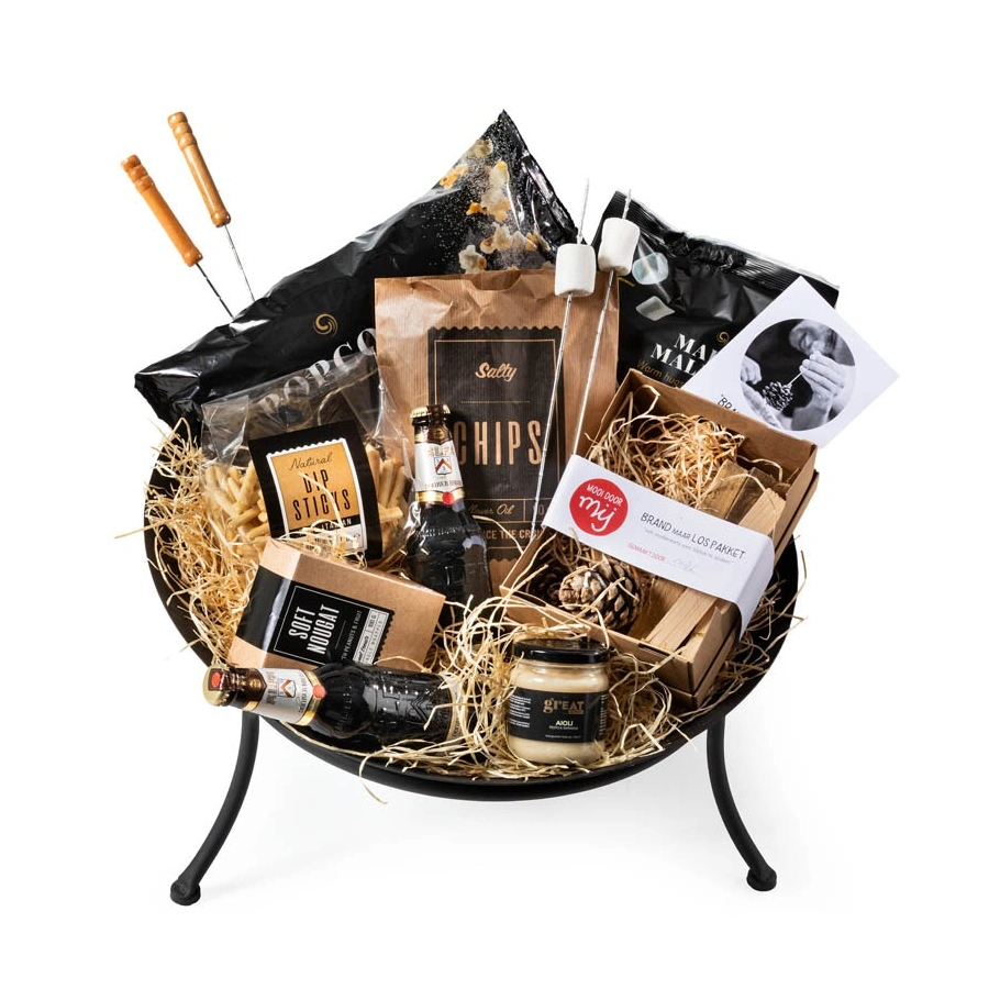 INHOUD: • Metalen vuurschaal op pootjes, Ø 47 x 21 cm • Brand maar los pakket • Set van 4 barbecuespiezen met houten handvat, 38,5 cm • Twee flesjes Alfa Donkerbruin bier, à 30 cl • Chips zout, 90 gram • Dipsticks, 140 gram • Aioli, 190 gram • Popcorn zoet & zout, 100 gram • Marshmallows, 140 gram • Nougat, 100 gram • Verpakt in een bijpassende geschenkdoos