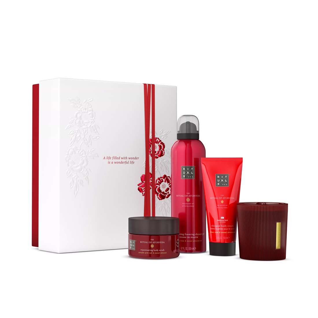 1 X The Ritual of Ayurveda Candle 140g for Gift Sets, 1 X The Ritual of Ayurveda Body Cream 100ml, 1 X The Ritual of Ayurveda Body Scrub 125g for Gift Set, 1 X The Ritual of Ayurveda Foaming Shower Gel for Gift Set
